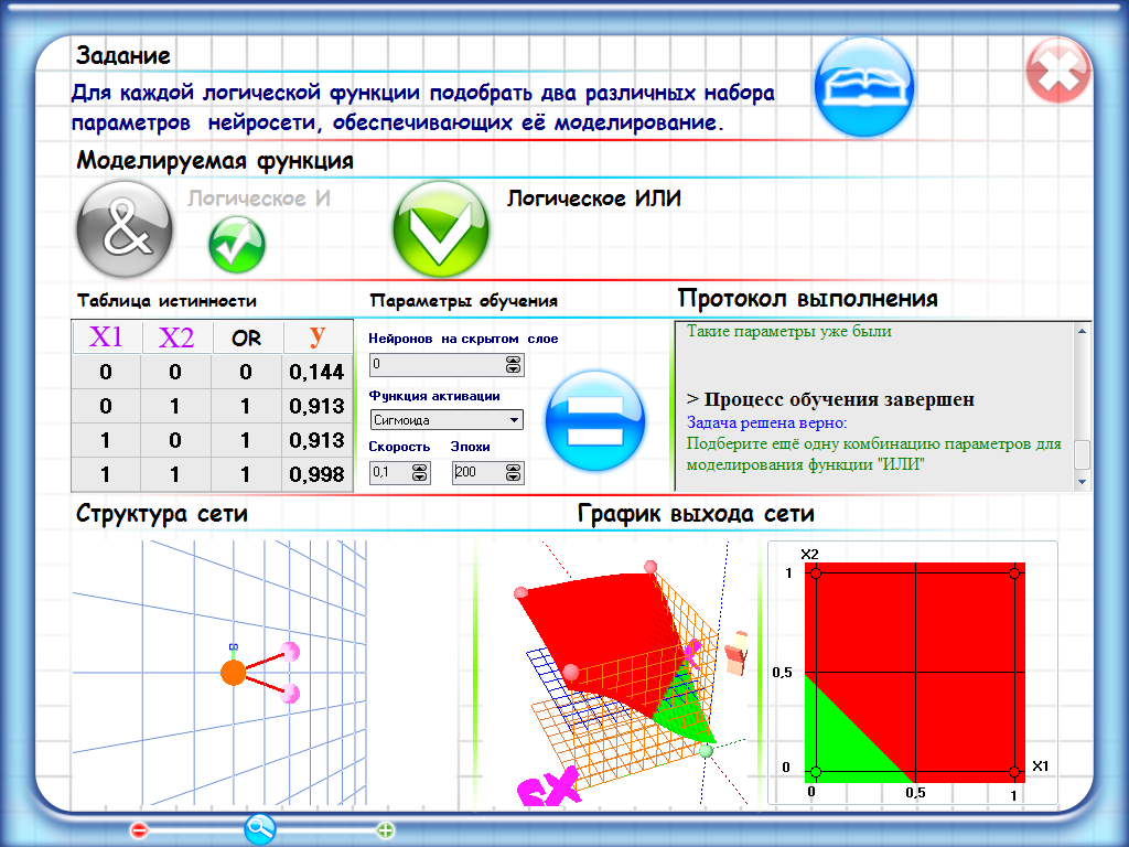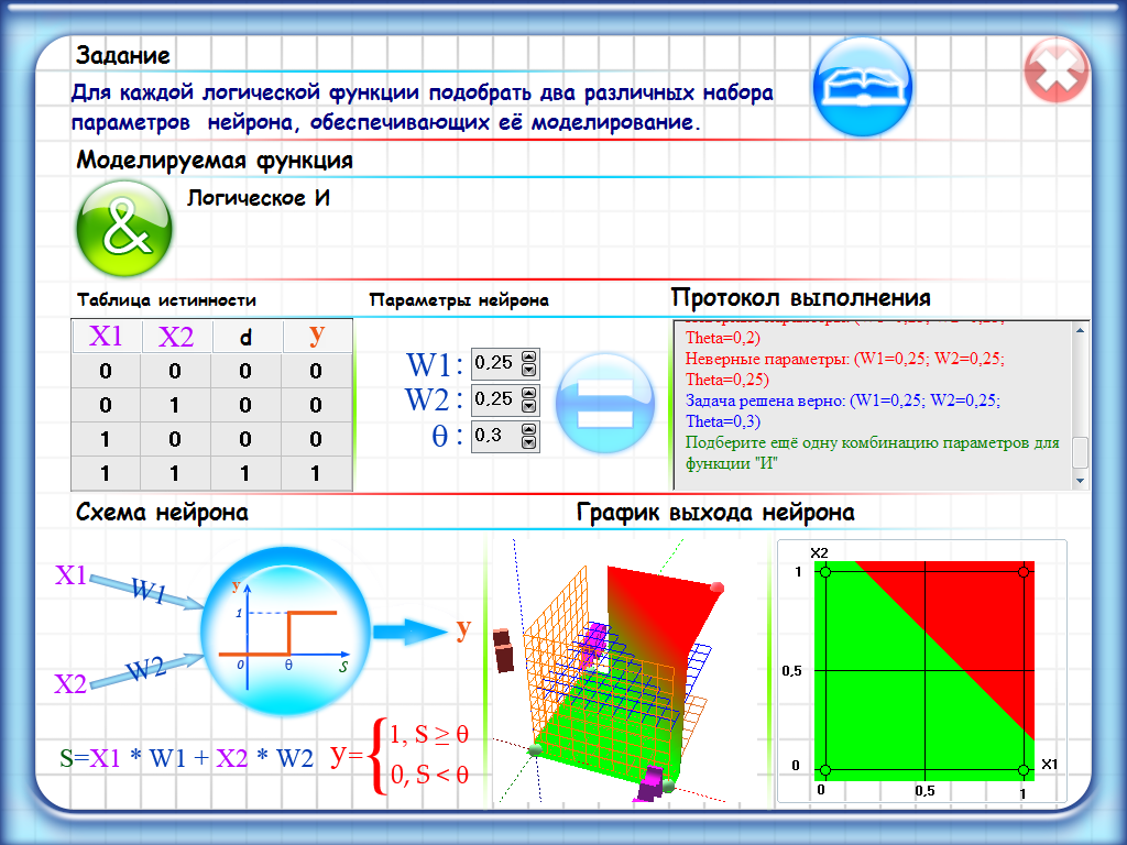 В распоряжении школьников имеется теоретический материал (открывается путем нажатия на кнопку в виде развернутой книги), таблицы истинности логических функций (слева по центру), схема математического нейрона с формулами его работы (слева внизу), графическое изображение работы нейрона (снизу по центру и справа).