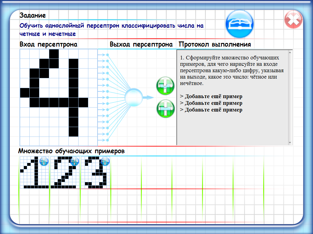 Читая «Протокол выполнения», школьники рисуют цифры на табло «Вход персептрона» и, отмечая их четность или нечетность, формируют множество обучающих примеров, которое постепенно располагается в нижней части рабочего окна. Путем нажатия кнопки «Обучить» (она появляется по ходу выполнения работы) школьники запускают процесс обучения персептрона, наблюдают за его графическим отображением, а затем убеждаются в правильности работы обученного персептрона.