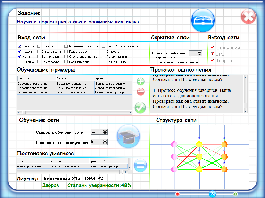 Школьники, исходя из собственных медицинских знаний, обучают нейронную сеть ставить такие диагнозы заболеваний, как грипп, пневмония, ОРЗ. Для этого они выбирают симптомы, которые считают важными для постановки диагноза, и формируют множество примеров постановки диагнозов пациентам, которых они сами придумывают.